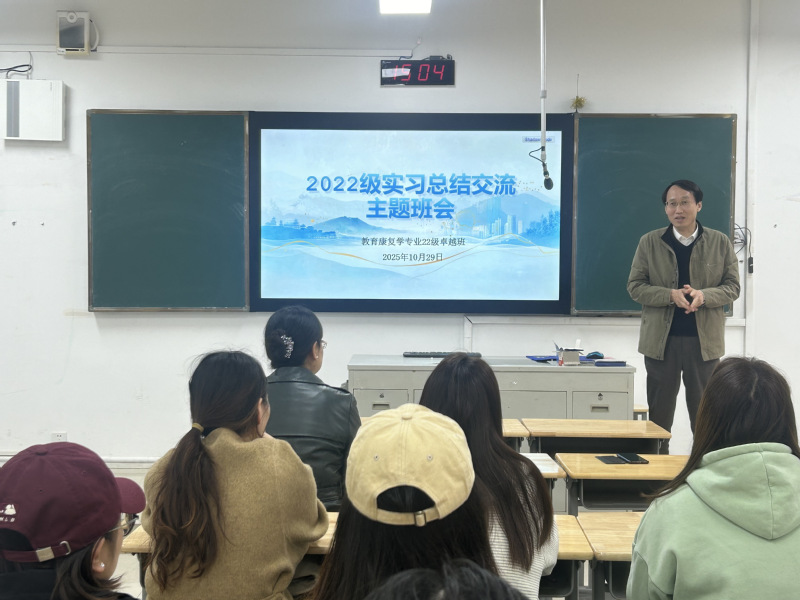 10月29日,康复科学学院2022级教育康复学专业4个班级在博雅楼教室分别召开实习总结主题班会,对两个阶段为期8个月的实习实践工作进行整体回顾和全面总结。康复科学学院党总支书记叶亮、教育康复学专业校内实习指导老师、2022级毕业班辅导员孔迪和教育康复学专业全体学生参会。