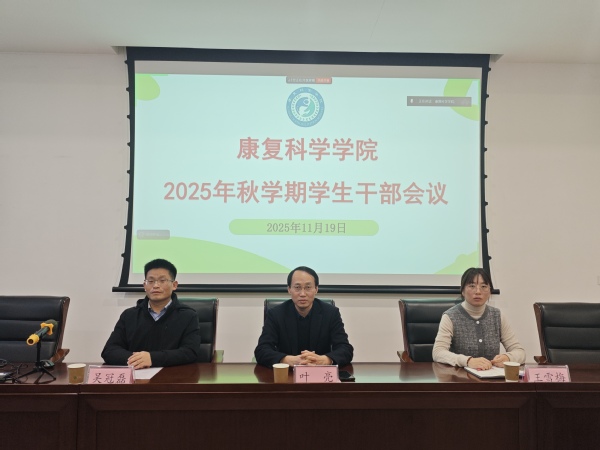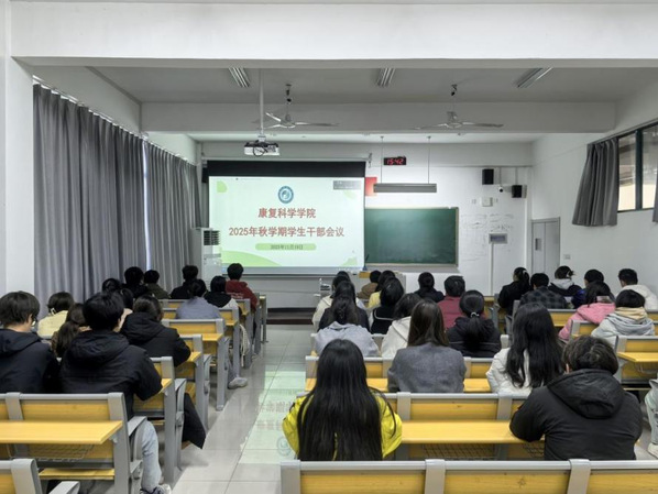 为进一步加强学生干部队伍建设,不断提高管理能力和综合素质,2025年11月19日下午,康复科学学院在实验实训大楼301会议室召开2025年秋学期学生干部会议。学院党总支书记叶亮、党总支副书记吴冠磊,全体辅导员、学院学生会、青年志愿者协会、新媒体中心全体成员及各班班长、团支书、学习委员、科创委员、宣传委员现场参会,2025级各班班团干部在江宁校区远程参会。会议由学院学工办主任(团总支书记)王雪梅主持。