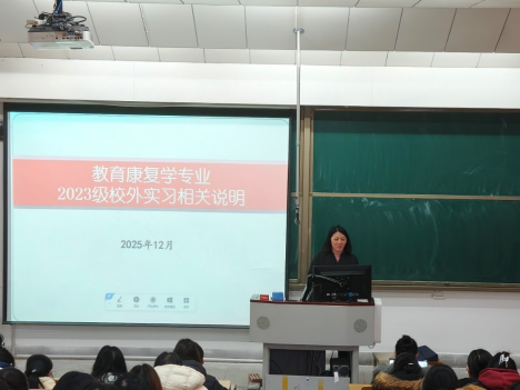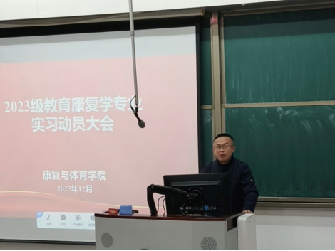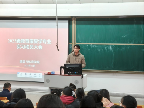 为助力学生明确实习任务与安排,保障实习工作平稳有序推进,康复与体育学院于12月24日在博韵楼212教室召开2023级教育康复学专业实习动员大会。康复与体育学院副院长徐冬晨、教育康复系主任许海燕、辅导员王国庆、负责实习管理工作的陈风琴老师,以及2023级教育康复学专业全体学生参加了此次活动。本次动员大会由2023级辅导员王国庆主持。