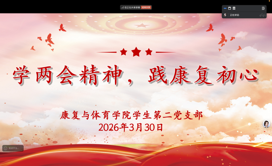 为深入学习贯彻2026年全国两会精神,找准专业发展与国家需求的契合点,明确学生党员的使命担当,3月下旬,康复与体育学院学生第二党支部开展“学两会精神、践康复初心”主题党日学习与实践活动,支部全体党员参与。
