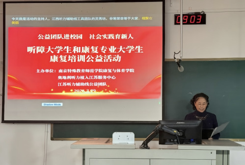 3月29日,南京特殊教育师范学院康复与体育学院携手江苏听力辅助线公益团队、奥地利听力植入江苏服务中心,在栖霞校区博雅楼举办了针对听障大学生和康复类专业大学生康复培训公益活动。本次活动以“公益团队进校园,社会实践育新人”为主题,通过公益活动的宣讲与相关知识的培训展开。